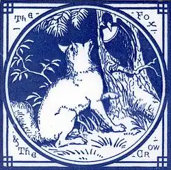 The fable also figured in church architecture, most notably on a column in the Romanesque church of San Martín de Tours in Spain. In later centuries the fable was used on household china,[31] on tiles,[32] on vases,[33] and figured in the series of La Fontaine medals cast in France by Jean Vernon.[34] A less conventional use was the hydraulic statue built for the Versailles Labyrinth that was constructed for Louis XIV, one of thirty nine sets of statues in the maze illustrating Aesop's fables.[35][36] The fox and the crow eventually figured, among many other beasts, on the grandiose monument to La Fontaine designed by Achille Dumilâtre in 1891.[37] This stood at the angle of the Jardins de Ranelagh between the Avenue Ingres and Avenue du Ranelagh in Paris XVI and was melted down during World War II. It was replaced by Charles Correia's present monument in 1983. This portrays the fabulist standing and looking down at the cheese-bearing crow at his feet, while the fox gazes up at it from the steps to the pedestal.[38] In Russia, too, there was an adaptation of La Fontaine's fable by Ivan Krylov, "The Crow and the Fox" (in this case little different from the French original),[39] which figures among several others on panels around Andrey Drevin's monument beside the Patriarch Ponds in Moscow.
