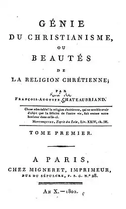 The Genius of Christianity, or Beauties of the Christian Religion (French: Le Génie du christianisme, ou Beautés de la religion chrétienne) is a work by the French author François-René de Chateaubriand, written during his exile in England in the 1790s as a defense of the Catholic faith, then under attack during the French Revolution. It was first published in France in 1802, after Chateaubriand returned to France following Napoleon's general amnesty for émigrés who had fled the Revolution. Napoleon, who had recently signed the Concordat with the pope, initially made use of Chateaubriand's book as propaganda to win support among French Catholics. Within five years, he would quarrel with the author and send him into internal exile.