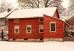 This frame building was built ca. 1850,[13] adjoining the log farmhouse. Henry Hess (1794-1867) constructed the building over a vaulted root cellar, which is one of three arch cellars at this homestead. Included in the building is a walk-in fireplace, previously used for butchering, making soap, heating laundry water, etc. A brick squirrel-tail bakeoven was located outside, attached to the fireplace.