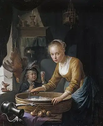 Other painters in this tradition, such as Gerrit Dou (1613–1675), depicted attractive maids with symbolic objects such as jugs and various forms of game and produce.[2] "In almost all the works of this tradition there is an erotic element, which is conveyed through gestures ranging from jamming chickens onto spits to gently offering — or so the direction of view suggests — an intimate glimpse of some vaguely uterine object," according to Liedtke. In Dou's 1646 painting, Girl Chopping Onions (now in the British Royal Collection), a pewter tankard may refer to both male and female anatomy, and the picture contains other contemporary symbols of lust, such as onions (said to have aphrodisiacal properties), and a dangling bird. Milk also had lewd connotations, from the slang term melken, defined as "to sexually attract or lure" (a meaning that may have originated from watching farm girls working under cows, according to Liedtke). Examples of works using milk this way include Lucas van Leyden's engraving The Milkmaid (1510) and Jacques de Gheyn II's engraving The Archer and the Milkmaid (about 1610).[7]