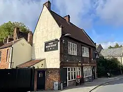 The Mischief occupies the remaining parts of a sixteenth-century courtyard house, with the east end (which faces the road) being rebuilt in the nineteenth century when the road was widened to accommodate trams.[1] It is situated on Fye Bridge Street, to the south of St Clement's Church. The house belonged to grocer and mercer Alexander Thurston who became mayor in 1600. In 1599, he incorporated stone fireplaces with his merchant's mark in the left-hand spandrel and the arms of his wife's family, the Aldrich family, in the right-hand spandrel. One of the fireplaces still exists and is behind the bar.[2] The north range is constructed of flint on a limestone pedestal.[2] On the north wall of this range are two six-light and one seven-light mullion windows on the first floor and three gable dormers.[1] Inside, the original floor and ceiling joists are later replacements. On the south wall of the north range, which overlooks a central courtyard, is an eight-light mullion window with arched transom. The wall also shows the spandrel of a wide arch which would have been situated above a large bay window, suggesting that the north range was once a hall. The rebuilt east range holds the parlour and an eight-light mullion window overlooking the courtyard.[2] The first floor contains two windows, with one a in a recessed canted bay.[3]
