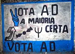 The Democratic Alliance (Portuguese: Aliança Democrática, AD) was a centre-right political alliance, in Portugal composed of the Social Democratic Party (PSD), CDS – People's Party (CDS–PP) and the People's Monarchist Party (PPM). It existed between 1979 and 1983, and was refounded for the 2024 legislative election. After its first official dissolution, the coalition was continued to operated in local elections after 1989 and presented lists across the country in every single local election after 2001.