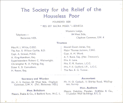 The Society for the Relief of the Homeless Poor is one of the oldest homeless shelters in London, dating back to 1820 when it was set up to respond to individuals left destitute after the Napoleonic War. One of the founders and the first Chairman was George Bridges,[1] an Alderman of London at the time.