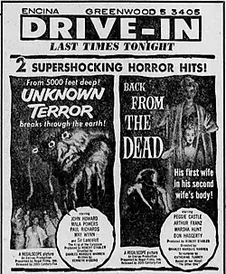 The Unknown Terror was the first film on a double-bill with Back from the Dead, both of which were made by Regal Films and were released in the US on August 12, 1957.[5] The pressbook for the films refers to them as "2 Supermonstrous Superhuman Supershockers!"[6]
