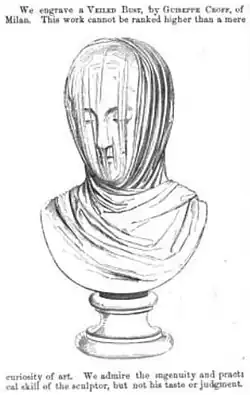 The Veiled Nun is a 20.75 in (52.7 cm) tall marble bust depicting a female figure wearing a veil. The fine details give the illusion that the veil is transparent. Although the title, The Veiled Nun, was already in use in 1874 when the work was first displayed in public,[3] she is not a nun, but rather a woman of means or an allegorical figure. Neither the woman's stylish coiffure that is visible through the veil nor the embroidered border of the veil are consistent with a nun's appearance.[4]