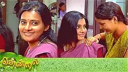 The show stars Shruthi Raj and Deepak Dinkar and revolves around a girl's struggle in a middle-class family, focusing on the importance of women's education. It was produced by Vikatan Televistas Pvt Ltd and directed by S. Kumaran.[1][2] The show replaced Kolangal and was replaced by Priyamanaval which both serials was also produced by Vikatan Televistas. Thendral was amongst the first Tamil serials to go viral on the internet.[3] The Indian newspaper Business Standard described it as the "first youthful prime time daily soap in Tamil".[4][5][6] Thendral has been highly acclaimed and has won many awards.[7][8][9] After a nine-year hiatus, the show returned from 10 December 2018 on Vikatan Prime Time YouTube channel every day. It was re-telecasting on Colors Tamil from 16 May 2022.[10]