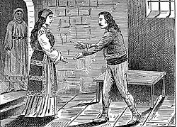 It came to pass that Samuel’s daughter, Cossara, was animated and inspired by a beatific soul. She approached her father and begged that she might go down with her maids and wash the head and feet of the chained captives. Her father granted her wish, so she descended and carried out her good work. Noticing Vladimir among the prisoners, she was struck by his handsome appearance, his humility, gentleness and modesty, and the fact that he was full of wisdom and knowledge of the LORD. She stopped to talk to him, and to her his speech seemed sweeter than honey and the honeycomb.[14]