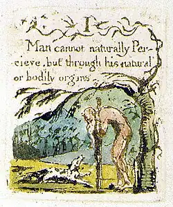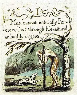 | Plate a4 (I) | ![]() | I Man cannot naturally Per- cieve, but through his natural or bodily organs | An old man, naked, leans on a walking stick and looks down at a dog on the ground, which looks up at him. In the background can be seen a hill and a clump of trees. A tree also grows on the right margin, a branch of which forms a canopy over the old man. Another branch extends to the top of the plate and separates the heading and the first line of text. At the far end of this branch, sits a tiny human figure, with a number of birds flying above him. | From Copy G. Three of the six original impressions of this plate are in colour (from Copies C, G and M; although all three differ from one another in their colouration), and three are in monochrome (from Copies A, B and D). The image is a metaphorical depiction of the text, with the old man perceiving through his bodily organs (his eyes). The dog may carry the symbolic association that Man's organic perceptions are no better or different than animals', i.e. if Man limits himself to his organic senses and adheres to the principals of Empiricism, he is no different, or better, than a mere animal; it is only by the acceptance of the spiritual and the imagination, faculties unavailable to animals and unique to Man, that he can rise above a strictly physical existence.[38] Blake would return to this concept in the planographic print Nebuchadnezzar (c.1795/1805). The posture of the man is based on that of a centurion in Raphael's Liberation of Saint Peter (1514).[37] As in the previous plate, with the small figures interacting with the text, "Blake has established an opposition between limited perceptions on the ground below the text and livlier, freer motifs above."[37] |