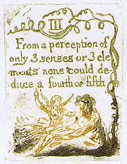 | Plate a6 (III) | ![]() | III From a perception of only 3 senses or 3 ele -ments none could de- -duce a fourth or fifth | A man with a beard sits on the ground, reaching to the left with both arms. A winged putto, visible from the waist up, appears behind the man's legs, and reaches towards the man's shoulder with his left hand. His right hand is pointed upwards. A tree grows on the right margin and branches out both above and below the heading. | From Copy G. The presence of the putto, and his gesture of pointing heavenward may indicate the spiritual perceptions beyond the reach of the "3 senses".[41] However, as Bindman notes, it is significant that the man does not look at or reach towards the putto or the sky. As such, if the putto or what he points at represent spiritual perceptions, the man is ignoring both of them, and concentrating instead on what his organic senses can perceive.[42] |