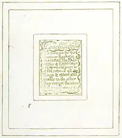 | Plate a3 (Argument) | ![]() | The Argument Man has no notion of moral fitness but from education Naturally he is only a natu- ral organ subject to Sense. | In the main picture, a woman is seated in a chair. Her legs are crossed and she holds a book, from which she appears to be reading. On the right stands a young girl, also holding a book from which she reads. On the left, a young boy is lying on the ground with his torso propped up on his left elbow. He too appears to be reading. Numerous tiny figures can also be seen in the vicinity of the words "The Argument". Furthest on the left, a figure leans against the vertical of the "T" in "The". Moving to the right, another figure, possibly winged, hovers above the space between "The" and "Argument". Next, a figure leans against the left diagonal of the "A". Another figure stands by the right diagonal of the "A" reaching up to the right towards a bird above the "u" and "m." Additionally, the first and last letters of the heading expand out into vines, as does the final "n" in "Education" in the main text.[36] | From Copy G. Three of the six original impressions of this plate are in colour (from Copies C, G and M; although all three differ from one another in their colouration), and three are in monochrome (from Copies A, B and D). The picture is probably a symbolic depiction of the education mentioned in the text. However, even here, Blake introduces a sense of contrariness, as the figures mingled amongst the text "may suggest a source of education more energetic and spiritual than can be provided by the books and vegetation below."[37] |