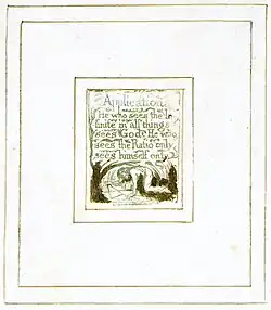 | Plate b11 (application) | ![]() | Application He who sees the In- -finite in all things sees God. He who sees the Ratio only sees himself only | At the bottom of the plate, a bearded man with long hair kneels on the ground and leans forward. His right hand holds a compass, with which he seems to be measuring the foot of a triangle inscribed on the ground. On the left margin stands a tree, one of its branches arching over the man, another extending up the margin and dividing the text from the header above it. | From Copy L. The man measuring the triangle refers to the concept of "the Ratio" as mentioned in the text.[54] "Ratio" is from the Latin for "Reason" ("Rationis"), and for Harold Bloom, "Ratio, in Blake's use, means an abstract image or ghost of an object, which in the aggregate makes up the universe of death which is the natural experience of most men."[55] Similarly, for Peter Otto, the plate depicts Nebuchadnezzar II as "Locke's Reason, closed within the 'Closet' of the mind while the triangle is one of the simple ideas that in Locke’s system provide the primary building blocks of knowledge."[56] For Eaves, Essick and Viscomi, the plate depicts enslavement to "abstract reason and bondage to material nature. The latter is emphasised by the barren tree and other vegetation that curve over the figure as though to entrap him."[48] Essick sees the illustration as a visual pun; the literal application of Reason to the earth (represented by the ground) itself.[57] David Bindman speculates that Blake may have been inspired in this image by an engraving he had done in 1782 after a Thomas Stothard design for the frontispiece of An Introduction to Mensuration by John Bonnycastle, which depicts a young child measuring some triangles.[58] Eaves, Essick and Viscomi suggest Blake may have been building on Raphael's depiction of Euclid in The School of Athens (1511).[48] Blake himself would use this image as the basis for two of his later planographic prints, Nebuchadnezzar (where he mirrors the posture) and Newton (where he mirrors the action; both c.1795/1805). |