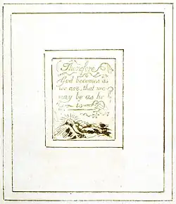 | Plate b12 (Therefore) | ![]() | Therefore God becomes as we are, that we may be as he is | Below the text, a man lies on a bed, facing outwards towards the reader. He seems to have lines of radiance emanating from his head. Several vines decorate the spaces all around the heading ("Therefore"). Another vine descends down the right margin near the third and fourth lines of text. On the left, the last letter of "may" extends into a small vine. Vines also surround the final word on the plate, "is", which is on a line on its own. | From Copy G. Although there is no way of knowing if the man is living or dead, the motif of the beams of radiance suggest he may be Christ, and thus the "God" who "becomes as/we are, that we/may be as he/is."[47][48] S. Foster Damon interprets this image as depicting an Incarnation, and the text as echoing the words of Athanasius; "He indeed assumed humanity that we might become God" (The Incarnation of the Word of God, 54). However "where the theologians all use the past tense, as of a historical event, Blake uses the present tense, for the act is eternal and is always going on."[49] Robert N. Essick believes the design perfectly reflects the text; "the Word (Blake's text) becomes the flesh (branches, leaves, etc); the flesh becomes the Word."[50] |