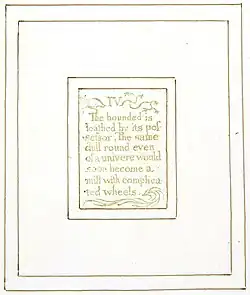 | Plate b6 (IV) | ![]() | IV The bounded is loathed by its pos- -sessor, The same dull round even of a univere would soon become a mill with complica- -ted wheels. | At the top of the plate, a vine fills the space above the text and to both the left and the right of the heading. A vine also runs along the bottom of the plate. | From Copy L. The only plate in Blake's two series in which there is no image of any kind, other than the vines at the top and bottom. However, the energetic vegetation could be interpreted as symbolising an escape from the "dull round" of empiricism.[46] |