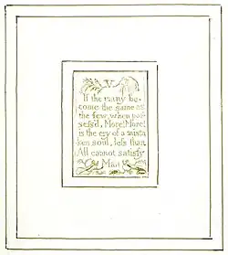 Relief etching was the same basic method used for woodcutting, and copper relief etching had been practised in the early 18th century by Elisha Kirkall, but Blake was the first to use such a method to create both words and designs mixed together on the same plate.[13] Apart from the unique aesthetic effects possible, a major advantage of relief etching was that Blake could print the material himself. Because the text was in relief, the pressure needed for printing was constant, unlike in intaglio printing, where different pressures were needed to force the paper into the furrows, depending on size. Additionally, intaglio etchings and engravings were printed with great pressure, but in relief etching, because the printed material was a raised surface rather than incised lines, considerably less pressure was required.[14] As such, relief etching tackled the problem of the division of labour of publishing. Blake's new method was autographic; "it permitted—indeed promoted—a seamless relationship between conception and execution rather than the usual divisions between invention and production embedded in 18th-century print technology, and its economic and social distinctions among authors, printers, artists and engravers. Like drawings and manuscripts, Blake's relief etchings were created by the direct and positive action of the author/artist's hand without intervening processes".[15] Blake served as artist, engraver, printer and publisher.
