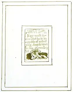| Plate b8 (VI) | ![]() | VI If any could de- -sire what he is in- -capable of posses- sing, despair must be his eternal lot | Below the text, a naked man, very muscular, sits on the ground, chains running from each ankle, and a shackle on the right ankle. His head is bowed over, looking at the ground and he clutches his head with both hands. | From Copy L. The presence of the shackle and chains suggests imprisonment and confinement. Additionally, the posture of the man and the way he clutches his head, suggests the "despair" mentioned in the text.[53] Blake would reuse this image in both America a Prophecy (1793) and The Book of Urizen (1794). |