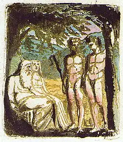 | Plate a1 (frontispiece) | ![]() | The Author & Printer W Blake | On the right, two young men, both naked, stand by a tree. The man farthest to the left holds a shepherd's crook in his right hand. On the left is seated an elderly couple, both wearing gowns. Another tree can be seen on the left margin, with its branches forming a canopy over the couple. In the distance, mountains are visible. | From Copy G. In the six known original impressions of this plate, "The Author & Printer W Blake" has been printed at the bottom of the page, but in Copy G, the text has been obscured by wash. Also, in all six impressions, the phrase is written in reverse, presumably because Blake forgot to write it in mirror lettering. In three of the six impressions (from Copies D, G and M) the young man's staff has been drawn in with black ink after the print; in the other three (from Copies A, B and C), the staff cannot be seen.[33] Eaves, Essick and Viscomi believe the image has connections to Ancient Greece, and is also symbolic of the structure of There is No Natural Religion as a whole. They suggest the posture of the man on the far right may be modelled after Praxiteles' Hermes and the Infant Dionysus, and the elderly man on the left may be sitting on a form of flutter-column "which suggests a classical setting and culture identified with the origins of rationalist philosophies. The differences in age and clothing between the two sets of figures structurally parallel the juxtaposition between natural and revealed religion in the text that follows."[34] |