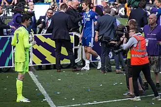 In April 2017, Courtois was ruled out for the match against rivals Manchester United, as a result of suffering a reported ankle injury, which he sustained in training.[54] Chelsea would go on to lose the match 0–2.[55] On 12 May 2017, Courtois kept his third consecutive clean sheet in a 1–0 away win over West Bromwich Albion, in which Chelsea secured the title.[56] Courtois also played for Chelsea in the FA Cup final; which Chelsea lost 2–1 to Arsenal.[57]