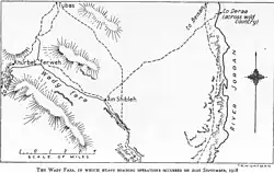 The Mafid Jozel ford was captured by the 2nd Battalion British West Indies Regiment, reinforced by the 3rd Light Horse Regiment, 1st Light Horse Brigade. Despite encountering strong resistance at Mellahet umm Afein, this force attacked and "drove in" the rearguard defending the ford and an Ottoman column withdrawing across the ford. Mafid Jozele was captured by 05:50 on 23 September, along with 37 prisoners, but the bridge had been destroyed at the ford.[64][65] The last remaining Ottoman defences on the western bank of the Jordan south of the Jisr ed Damieh bridge had thus been captured, although most of the Ottoman defenders of these two fords managed to escape.[63] Captures included 105 prisoners, 4 machine guns, 4 automatic rifles, transport, horses and stores.[64]