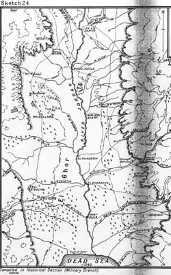 The Ottoman front line had been strengthened after the Second Transjordan attack. It began in the south, where Ottoman cavalry guarded tracks to Madaba before continuing with strongly wired entrenchments. In front of these, advanced posts extended from the foothills opposite the ford across the Jordan River at Makhadet Hijla to about 4 miles (6.4 km) north of the Jericho to Es Salt road. The road had been cut at the Ghorianyeh Bridge before the First Transjordan attack, in the vicinity of Shunet Nimrin. The front line was strengthened by advanced posts which were also wired on the left flank at Qabr Said, Kh. el Kufrein and Qabr Mujahid. From their right flank in the foothills a wired line of redoubts and trenches facing south ran from 8,000 yards (7,300 m) north of Shunet Nimrin, across the Jordan Valley to the Jordan River, 1,000 yards (910 m) south of the Umm esh Shert ford.[12][13][14] This line was continued west of the river by a series of individual "wired-in redoubts with good fields of fire,"[15] then as a series of trenches and redoubts along the northern or left bank of the Wadi Mellaha. These were followed by a "series of trenches and redoubts towards Bakr Ridge which were entrenched but not wired. A strong advanced position of well built sangars and [sic] [which were] wired in was held at Baghalat."[13] Bakr Ridge in the Judean Hills was situated to the west of the salient at El Musallabe which was held by the EEF. The Ottoman front line was supported by entrenched positions on Red Hill beside the Jordan River, which was also the site of their main artillery observation point.[12][13][14]