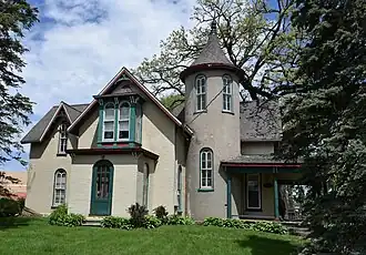 The Thomas Arthur House is a historic residence located in Newton, Iowa, United States. Arthur was a land agent who held two offices in Jasper County government. He was also one of the incorporators for St. Stephen's Episcopal Church in Newton, was involved in acquiring the property for the church, and may have donated it.[2] He moved his family to Oakland, California about 1876, and the house was sold to the Rev. Joseph Evans Ryan, the Rector for St. Stephan's. Built in 1865, the painted brick Late Gothic Revival house is the only elaborate house in that style in the city, and only one of a few such houses in central Iowa.[2] Its distinguishing feature is a three-story, round tower with a flared, conical roof. The only access to the second floor is by way of the tower. The house was listed on the National Register of Historic Places in 1982.[1]