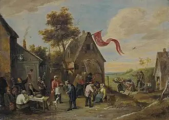 His genre scenes depict most of the subject matter also covered by David Teniers the Younger: village festivals, the interiors of taverns, village scenes or landscapes with peasants engaged in various activities, singeries, guardroom scenes and laboratories of alchemists. His style is also close to that of Teniers although he was less skilled in the rendering of figures. Some of his works have likely been attributed to Teniers.[1] He also made copies after works of Teniers such as the Old woman and two peasants in a barn with a splendid kitchen still life (Dorotheum (Vienna) auction of 17 October 2007, lot 440).[6] He also copied works of followers of Teniers such as David Ryckaert III.[7]