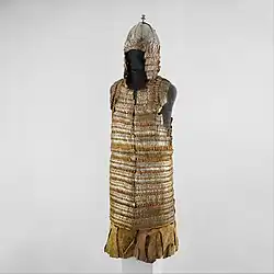 According to Donald J. La Rocca of the Metropolitan Museum of Art's Department of Arms and Armor, Tibetan soldiers were most commonly protected by body armor, a helmet, and a rattan-reed shield reinforced with iron struts.[1] Tibetan cavalry also protected their horses's bodies with thin leather armor and their heads with thick iron plates. The most common form of Tibetan armor was lamellar armor called byang bu'i khrab, which was created by overlapping squares of force-absorbing material.[2]