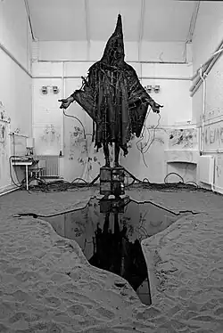 The influence of myth, seen in Shaw's early work, is once again present in his 2008 sculpture, Minotaur, a piece that was commissioned to mark the opening of Harrison Birtwistle's Opera, The Minotaur.[7] After this, however, the more political side to his work becomes increasingly evident with a number of sculptures responding to issues such as terrorism and the war in Iraq.[8] At this time Shaw was working in London as a Fellow sculptor at the Kenneth Armitage Foundation. The main works he produced during this 2006 to 2008 residency were Man on Fire: What God of Love Inspires Such Hate in the Hearts of Men, Tank on Fire (awarded the selectors' choice Threadneedle prize in 2008),[9] and the multi-sensory installation Casting a Dark Democracy – Shaw's haunting response to the now infamous image of the Abu Ghraib prisoner, described as "one of too few works to engage unequivocally with the reality and human cost of the Iraq war."[10]