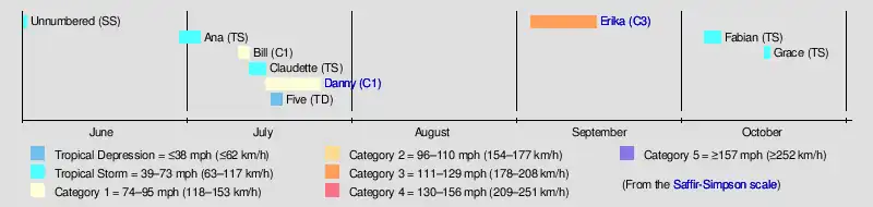 - 18:00 UTC (2:00 p.m. AST) at 12°18′N 47°06′W / 12.3°N 47.1°W – The recently formed tropical depression strengthens into Tropical Storm Erika about 920 mi (1,480 km) east of the Lesser Antilles.[15]