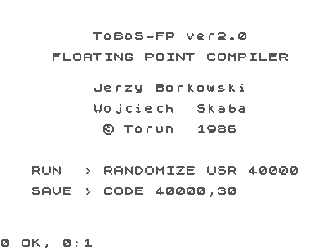 Компилятор Tobos FP (Tobos Floating Point) появился на свет в Польше в 1986 году и стал на сегодняшний день, пожалуй, наиболее популярным из всех известных бейсик-компиляторов для ZX Spectrum.