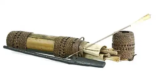 The Tolor is made of a piece of bamboo. Among its myriad uses, bamboo makes an excellent cylindrical container. This bamboo quiver was made to carry the slender darts for a Dayak hunter's blowpipe. As these darts were often treated with plant poison, they had to be carefully protected.[2] A partition between the segments forms the bottom. The lid is likewise made of a similar piece of which a partition forms the upper part, or is made of wood in the form of a cone or a semi-circular upper side. A wooden girdle hook is attached to the quiver by means of woven strips of rattan.[3] The forked stick bound with plaited rattan to the base of the quiver was hooked through the hunter's belt for carrying.