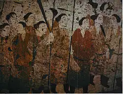 Murals cover more than 300 square meters of the tomb.[5] To prepare the walls for the paintings, they were first coated with white plaster on which the artist outlined the design and filled it in with color.[1] The murals begin immediately upon entering the passageway. Going down, towards the coffin chamber, both walls alongside the path are covered with paintings. They begin with images that are now damaged but were probably mythical birds followed by an honor guard, and then, closest to the chamber, are groups of men leading riderless horses. On either side of the entranceway, doormen stand solemnly holding whips. All four walls and ceiling of the tomb chamber are painted. The north wall, directly opposite the entrance, shows the deceased and his wife on a canopied funerary couch,[6] presiding over a feast and surrounded by musicians playing Central Asian instruments.[7] On the western wall, the mural depicts a tacked-up riderless horse under a canopy, preceded by an honor guard. The focus of the eastern wall is an oxen-pulled chariot under a canopy. Like the western wall, an honor guard also precedes the chariot.[8] The south wall shows the honor guard. The clothes of the people in the murals are typical of the Xianbei people of that time.[9]