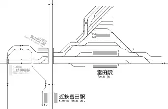 Tomida Station (富田駅, Tomida-eki) is a passenger railway station in located in the city of Yokkaichi, Mie Prefecture, Japan, operated by Central Japan Railway Company (JR Tōkai). It is also a freight depot for the freight-only Sangi Railway.