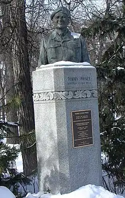 He died in 1977 at Winnipeg's Deer Lodge Centre, a health care facility specializing in geriatric care and treatment of veterans, and was interred in Brookside Cemetery, Winnipeg. Despite the reduced circumstances of his later years, he had retained his fame and he was given a provincial state funeral, a notable event with significant official representatives and more than 500 people in attendance.[59] At his state funeral service, a delegation from the Princess Patricia's Brigade served as his pallbearers. A group of men from the Saulteaux nation sang the "Death of a Warrior" song while his body was lowered into the grave. The PPCLI officer in charge of the military funeral service presented Prince's daughter Beverley Prince with the folded flag which had been draped over Tommy Prince's coffin. Official representatives included the Lieutenant-Governor of Manitoba on behalf of The Crown, senior officers of the Canadian Army, and the Consuls of France, of Italy and of the United States representing the respect for Prince of those nations.[59] Prince's daughters Beryl and Beverley Prince were astonished at the impressive public response at the funeral of a man who had subsisted on menial jobs during his later years and they wondered where public officials had been during Prince's years of struggle with war wounds and unemployment.[41] Prince had never discussed his war record with his daughters, and they were unaware of his status as a public hero before the funeral.[60]