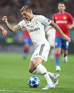 In 2016, Kroos became a part of a collaboration between the German Football Association and The LEGO Group, who in May released a Europe-exclusive collectible minifigure series, with Kroos featured as the tenth of sixteen minifigures in the collection.[60] On 12 October 2016, he signed a new contract until 2022, and by the end of the year he was once again nominated to the FIFA FIFPRO World 11 and the UEFA Team of the Year.[61] He scored the winning goal for Real Madrid in the 81st minute of the game against Celta Vigo as Real Madrid won their first home game of the La Liga season by 2–1.[62] He was a regular starter when Madrid won the 2016–17 La Liga and later defended their title in the 2016–17 Champions League. He became the first German player to win the trophy three times.[63][64][65] At the end of 2016–17, Kroos was the most used player under Zidane.[66] During the 2017–18 Champions League, he made twelve appearances, when Madrid won their third consecutive and 13th overall Champions League title.[67]