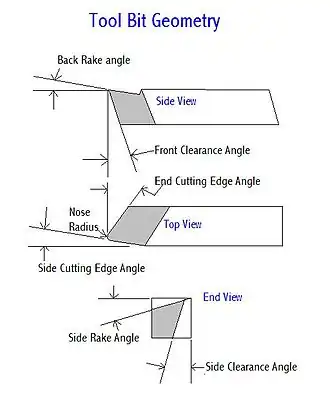 All the other angles are for clearance in order that no part of the tool besides the actual cutting edge can touch the work. The front clearance angle is usually 8 degrees while the side clearance angle is 10-15 degrees and partly depends on the rate of feed expected.
