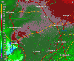 After isolated tornado and widespread hail activity in Texas the previous day, March 25 brought another severe weather outbreak to the Deep South, where a high risk outlook was issued for the second time in eight days. This included a 30% risk for tornadoes, with the potential for multiple strong and long-tracked tornadoes noted in the outlook discussion.[55] The first supercell of the day produced three low-end EF3 tornadoes in central Alabama with the second one prompting a tornado emergency—the first of three issued during the outbreak—in Shelby County, Alabama.[56][57] That tornado damaged or destroyed many homes in the southern suburbs of Birmingham. The home of broadcast meteorologist James Spann was one of the residences damaged by this tornado.[58][59][60] The third tornado destroyed a manufacturing facility and a church, and badly damaged or destroyed many homes in and around Ohatchee, Alabama, killing six people. A long-tracked EF3 wedge tornado also tracked over 80 miles (130 km) across five counties in central Alabama for 98 minutes, causing significant damage near Sawyerville, Greensboro and Brent while injuring 13. The most intense tornado of the event was a low-end EF4 tornado that caused major damage in Newnan, Georgia, during the overnight hours, leveling homes and resulting in one indirect death due to a heart attack.[61]