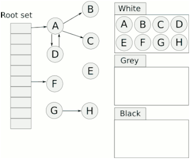 - The grey set contains all objects reachable from the roots but yet to be scanned for references to "white" objects. Since they are known to be reachable from the roots, they cannot be garbage-collected and will end up in the black set after being scanned.