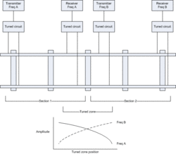 There is often a gap between where frequency A is received and frequency B is injected. This is referred to as a 'tuned zone' and is a section of track where the amplitude of frequency A reduces in the direction of section 2 and the amplitude of frequency B reduces in the direction of section 1. The tuned zone can be of the order of 20 m long.