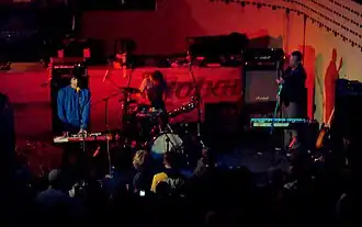 Nathan Means (bass, keyboards, vocoder, vocals), Philip Manley (lead guitar, bass, keyboards, vocals), and Sebastian Thomson (drums, bass, keyboards, guitar, vocals) formed Trans Am in 1990 near Washington, D.C.[1] Initially influenced by local hardcore and post-hardcore bands Fugazi, Bad Brains, and Soulside, Trans Am quickly moved away from that sound[2] and began drawing from such bands as Chrome, This Heat, Van Halen, Manowar,[3] and in particular electronica acts such as Kraftwerk, Aphex Twin, and Autechre.[4][5] According to Thomson, they had searched for a unique sound and "were floundering until one day we hooked up a Casio keyboard in 1993 and realized that a keyboard can also be a punk instrument."[5] Sometime around 1993, Trans Am had a lead singer, who was eventually fired for missing rehearsals, and the band opted not to replace him.[6] Since then, Trans Am's music has been largely instrumental.[6]