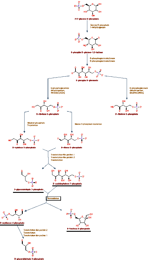 This shows the pentose phosphate pathway in humans with transaldolase catalysing the following reaction:[9]
