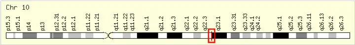 This image shows the cytogenetic band of human chromosome 10 and the various gene locations on it. TMEM254 can be seen at the thin red band with the box around, placed at q22.3.[2]