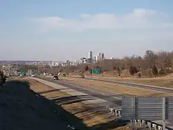 Interstate 44 and the Skelly Drive Bypass crosses Tulsa through midtown from east and west. Its sister highways, Interstate 244 and Interstate 444, make up the inner-dispersal loop surrounding downtown and wrap through the northern part of the city, reconnecting to Interstate 44 in the east and southwest parts of the city. U.S. Highway 412 leaves the city from its most eastern and western points, but through most of its duration in Tulsa, it is primarily concurrent with Interstate 244. U.S. Highway 64 forms the Broken Arrow Expressway to the east and goes as far as the Sand Springs Expressway to the west. U.S. Highway 75 traverses West Tulsa through downtown going north and south, and U.S. Highway 169, also called the Mingo Valley Expressway or the Pearl Harbor Memorial Expressway, generally crosses the city in its eastern areas in a north–south direction. State Highway 11 serves the Tulsa International Airport, connecting from I-244 and Highway 75. The Creek Turnpike splits away from Highway 169 from the South and Interstate 44 from the East, bypassing most of the city of Tulsa and the suburb of Broken Arrow, eventually reconnecting with I-44 in Catoosa to the east and Jenks to the west.