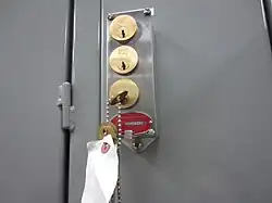 Some complex sequences use key exchange blocks or boxes, that allow alternative sequences of operation. Interlock devices may have an electrical solenoid which holds the key until an electrical circuit is interrupted; for example, the power supply for a high-voltage cabinet has been de-energized, releasing a key to allow access to the interior of the cabinet. Some interlocks include a time delay function or a rotation detector to ensure a machine has had time to come to a stop before allowing the next step of an interlock sequence to proceed.[4] A key exchange block may only hold and release keys and may not have a bolt to interlock process equipment, or may be part of the interlock of a particular machine or device.