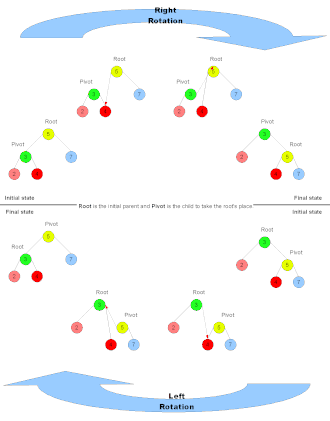 - AVL tree, red–black tree, and splay tree, kinds of binary search tree data structures that use rotations to maintain balance.
