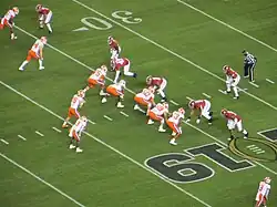 Lawrence started his freshman season behind Kelly Bryant on Clemson's depth chart, but was given equal playing time in the season's first games. Head coach Dabo Swinney named Lawrence the new starter after four games, after which Bryant announced his intention to transfer schools.[13] Lawrence led Clemson to an undefeated regular season, a 42–10 victory over Pittsburgh in the ACC Championship Game, and a bid to play in the College Football Playoff. The Tigers were ranked No. 2 in the College Football Playoff rankings, and defeated No. 3 Notre Dame, 30–3, in the 2018 Cotton Bowl Classic.[14] They advanced to the 2019 College Football Playoff National Championship game, where they defeated Alabama, 44–16, handing the Crimson Tide their worst loss of the Nick Saban era.[15] Lawrence was named Offensive MVP of the game and became the first true freshman quarterback to start for a national champion since Jamelle Holieway in 1985 for Oklahoma.[16]
