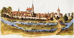 The Tribeden are mentioned for the first time in 955. The Tribusses territory was mentioned in 1136, and the castle was incorporated by Pope Innocent II into the newly formed Bishopric of Wolin in 1140.[3] It formed part of the Duchy of Pomerania, and around 1184 it passed to the Slavic Principality of Rügen, a vassal of Denmark.[3] The town is mentioned in a document in Lübeck in 1241. In 1245 it is noted that the Neuenkamp monastery (Kloster Neuenkamp) had the right of patronage over the church in Tribsees.[2] An agreement between the city council of Stralsund and that of Tribsees exists from 1267, and in 1285 the town was granted Lübeck law by Prince Vitslav II.[2] In 1310 King Eric VI of Denmark granted the town to Margaret, wife of Prince Vitslav III, as a hereditary lease, reserving, however, the right of redemption if the prince died without male descendants.[4] During the Wars of the Rügen Succession, in 1328 it passed to Mecklenburg, and in 1355 it became part of the Duchy of Pomerania.[2][4]