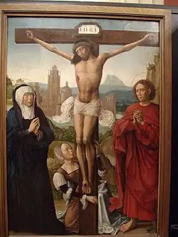 Triclavianism is the belief that three nails were used to crucify Jesus Christ. The exact number of the Holy Nails has been a matter of speculation for centuries.[1] Three nails are sometimes depicted as a symbolic reference to the Holy Trinity. In the early Church, two nails were posited by Ambrose (omitting any in the feet),[1] notably in Ambrose's De obitu Theodosii.[2] Nonnus of Panopolis, in his paraphrase of the Gospel of John, has the crowd cry for Jesus to be crucified upon "four spikes" (19:15)[3] but eventually hung with only three, "a single nail [...] hammered into both his feet" (19:18).[4]
