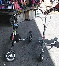 The Trikke (/ˈtraɪk/ tr-EYE-k; also known as a wiggle scooter, scissor scooter, carver scooter, Y scooter, or V scooter) is a chainless, pedalless, personal vehicle with a three-wheel frame. The rider stands on two foot platforms above the two rear wheels and steers the vehicle with handlebars attached to the lone front wheel. The cambering system is designed to provide a stable, three-point platform that lets the rider lean into turns while all three wheels remain in contact with the ground. There are several variations of the Trikke, from body-powered fitness machines, to battery-powered transportation and personal mobility vehicles.