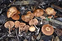 The mushroom cap is 1–4 cm wide, orange-brown, convex to flat and depressed, with small marginal patches of veil which disappear with age or rain; its odor is mild.[5] The gills are brown and adnate to slightly decurrent.[5] The stalk is 1–6 cm tall and 2–4 mm wide.[5][2] The spores are pale reddish-brown, elliptical, and smooth.[5] The spore print is brown.[6]