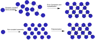 Supramolecular assembly requires non-covalent interactions directing the formation of 2D polymers by relying on electrostatic interactions such as hydrogen bonding and van der Waals forces. To design artificial assemblies capable of high selectivity requires correct manipulation of energetic and stereochemical features of non-covalent forces.[11] Some benefits of non-covalent interactions is their reversible nature and response to external factors such as temperature and concentration.[12] The mechanism of non-covalent polymerization in supramolecular chemistry is highly dependent on the interactions during the self-assembly process. The degree of polymerization depends highly on temperature and concentration. The mechanisms may be divided into three categories: isodesmic, ring-chain, and cooperative.[12]